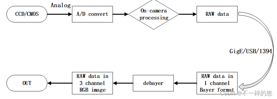 如下流程图所示,CCD/CMOS传感器向照相机提供模拟信号。经数模转换后,我得到了原始数字信号由于必须考虑原始数据和传输带宽的大小,摄影机内需要预处理。最初的信号加速了原始图片数据以RAW格式检索。RAW 是一个光* 高级贝耳数据格式,有单一频道大小。Debayer(Bayer算法)必须应用于三道RGB图片。