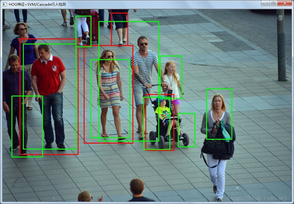 SVM 和 Cascade 测试得出以下结果,分别以红色和蓝色矩形框标出: