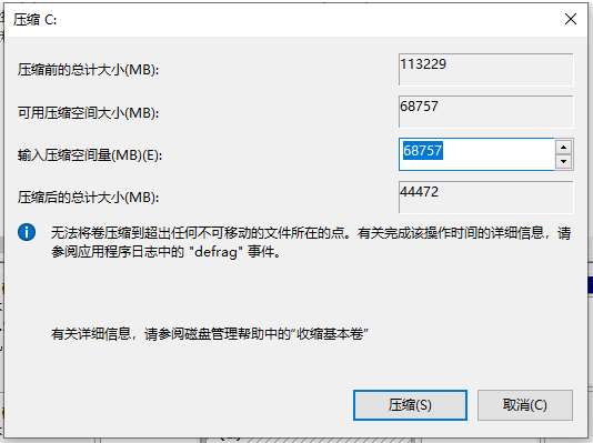 3、输入压缩空间量,其大小由接下来要安装的win7系统决定。此处选择安装win7系统,确定压缩空间为50000MB。