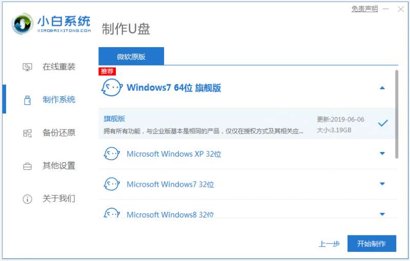2、选择需要安装的操作系统,点击开始制作。(已经下载了iso镜像系统的网友,这里可以随意选择一个系统制作启动盘即可)