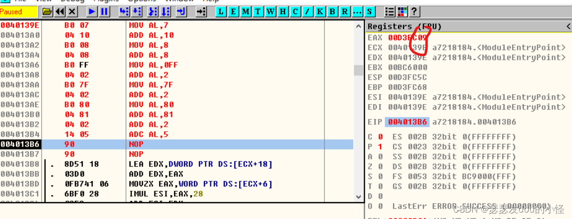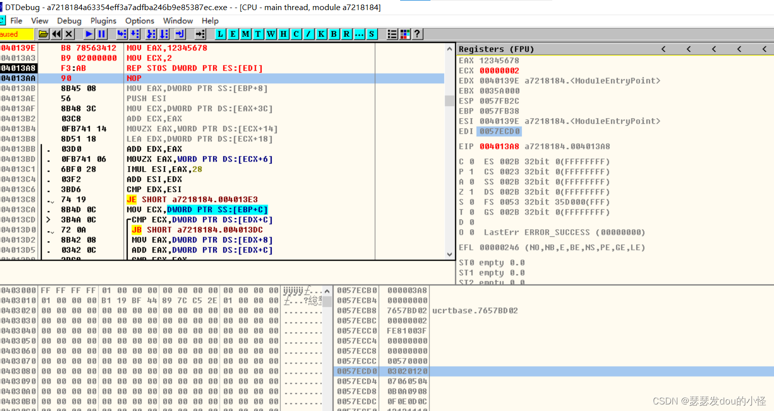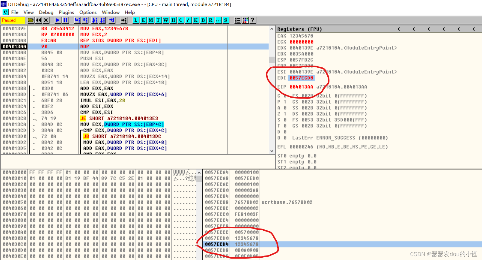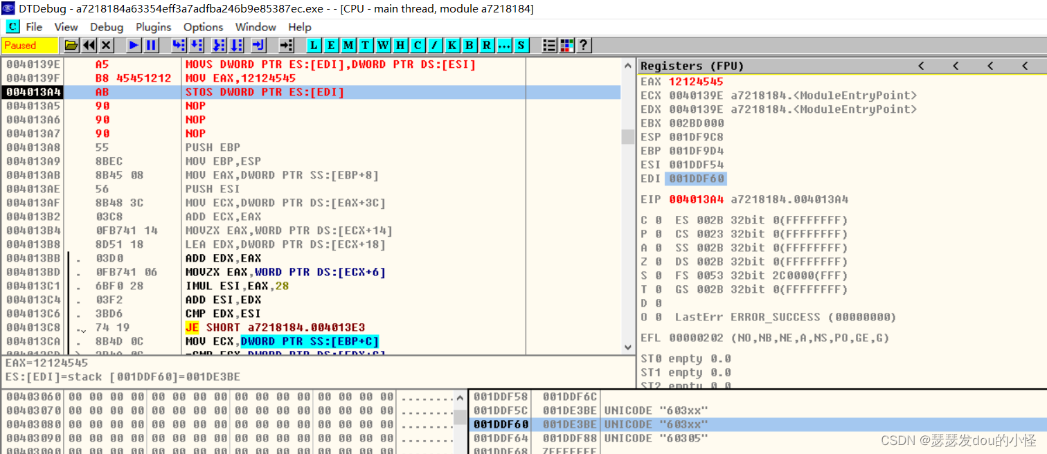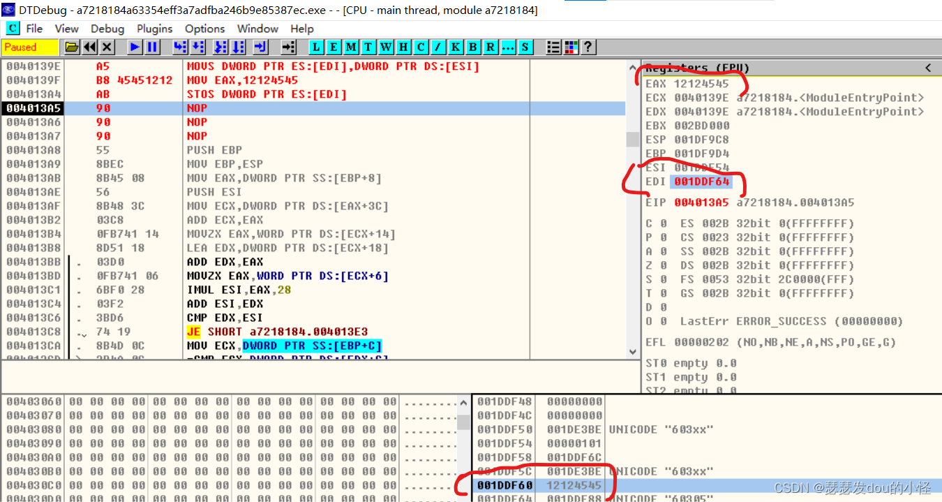 这里刚执行完mov eax,12124545 ,接下来注意edi对应的内存编号存储的数据