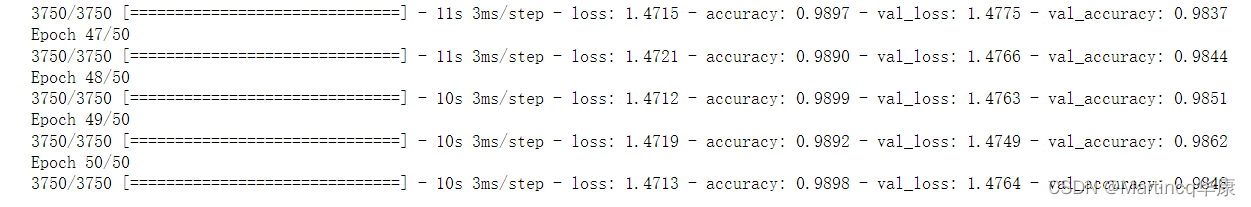开始模型训练,这里我设置的是50轮训练次数,实际上10多次的时候模型已经达到稳定状态了。训练结束后会得到这样的结果: