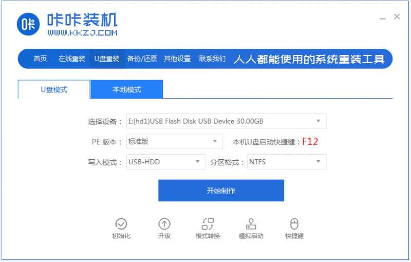 1、在一台可用的电脑上安装好咔咔一键重装系统工具打开,插入空白u盘,选择u盘重装系统模式点击开始制作启动盘。