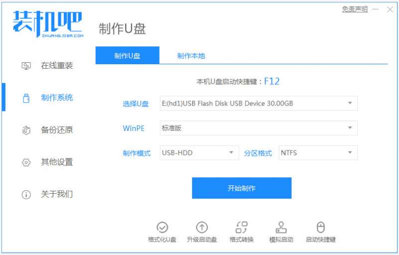 安装装机吧一键重装系统工具制作win10 u盘启动盘;
