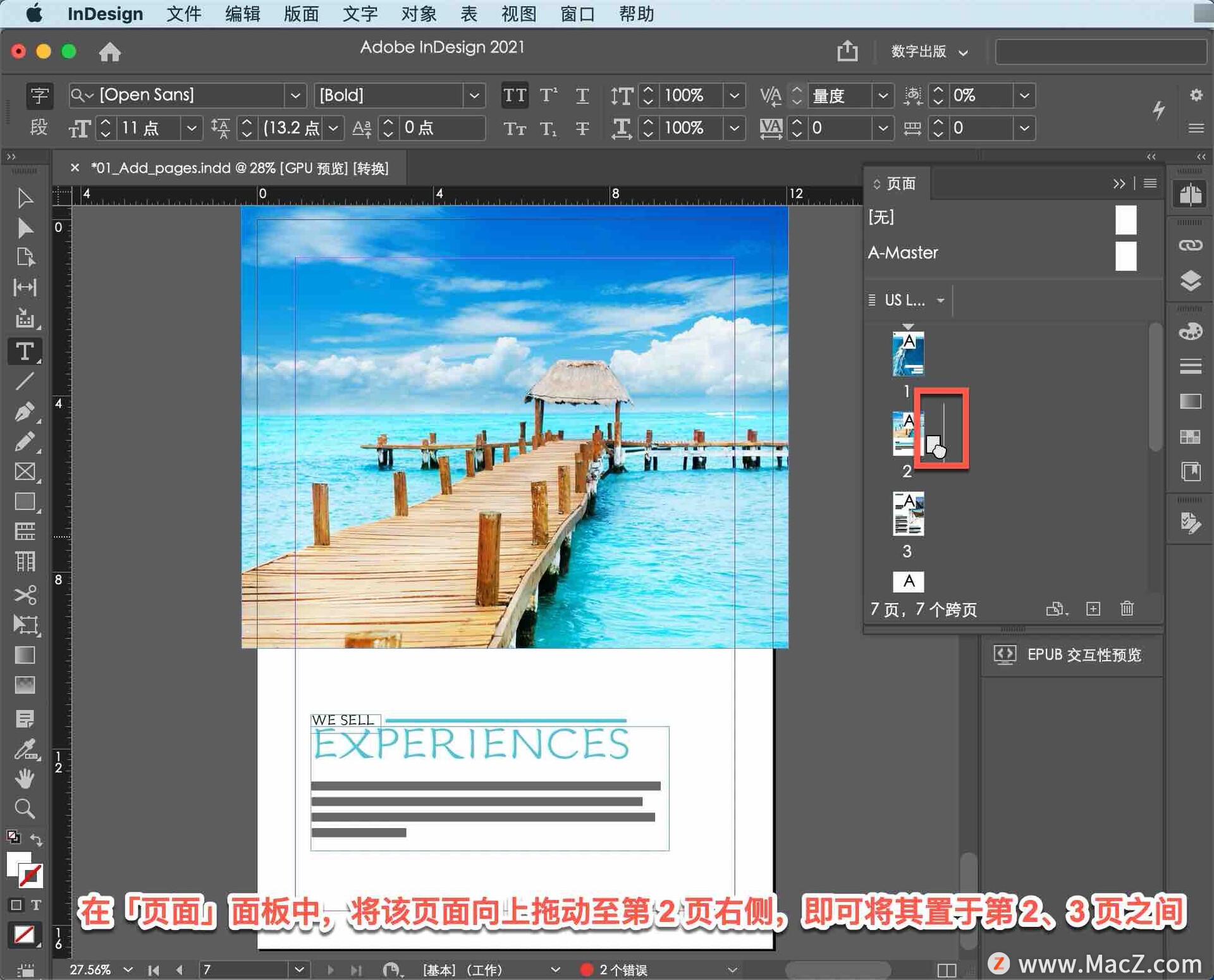 在「页面」面板中,将该页面向上拖动至第 2 页右侧,即可将其置于第 2、3 页之间。
