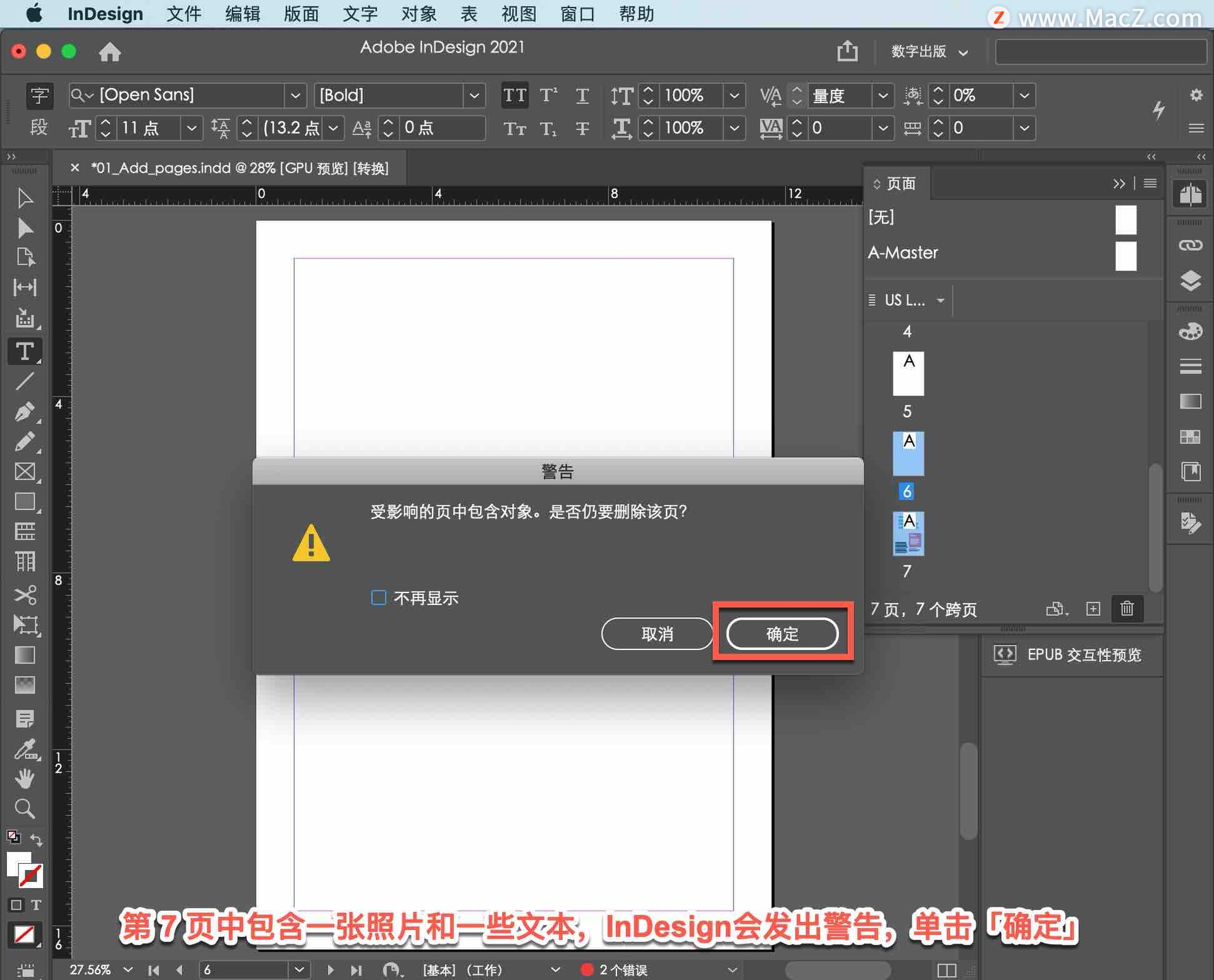 因为第 7 页中包含一张照片和一些文本,InDesign会发出警告,单击「确定」,这两个页面即被删除。