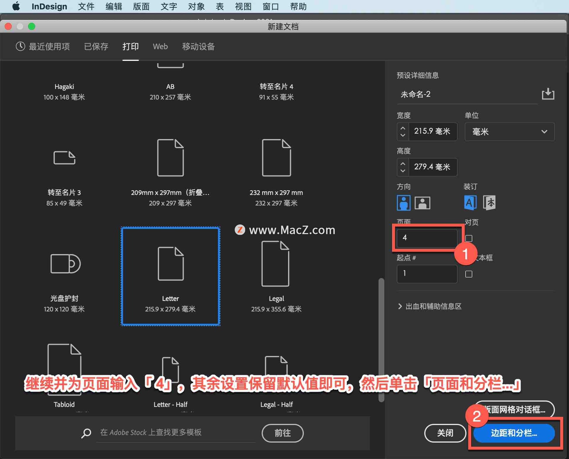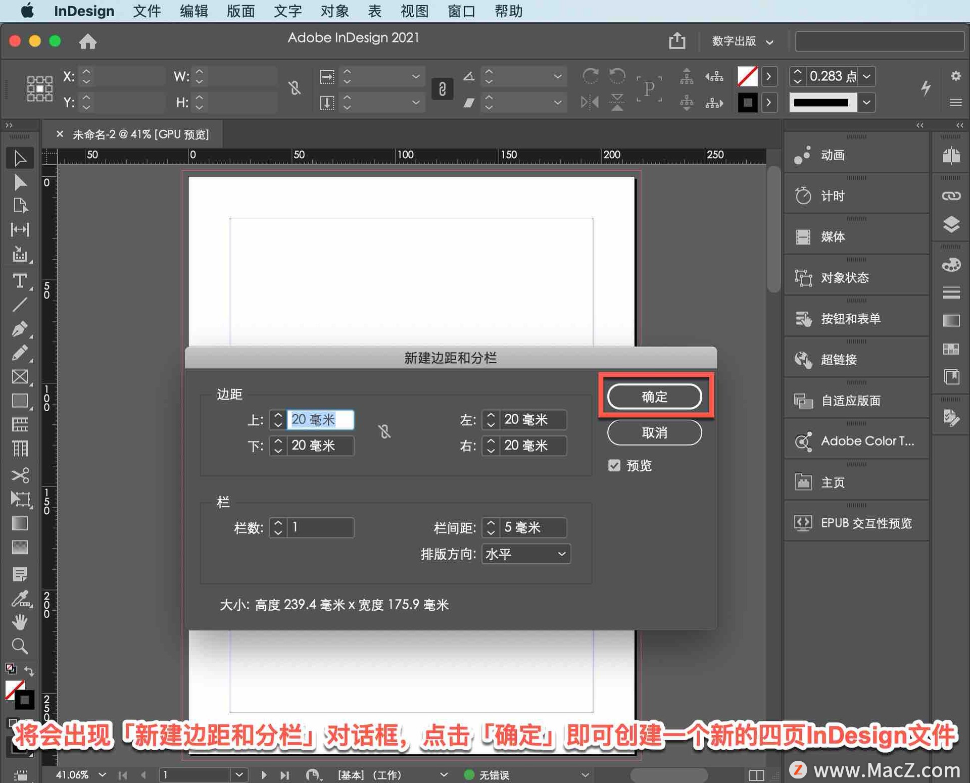 将会出现「新建边距和分栏」对话框,点击「确定」即可创建一个新的四页InDesign文件。