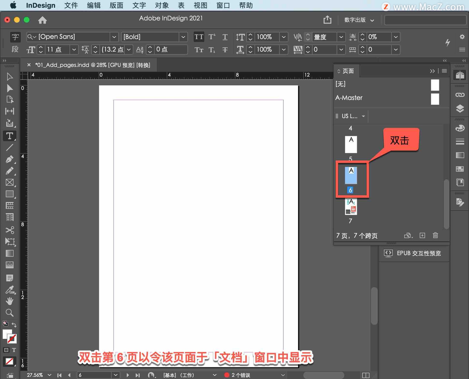 接下来删除页面,我们已经决定不需要空的第 6 页,以及还包含一些设计元素的第 7 页。要删除这些页面,双击第 6 页以令该页面于「文档」窗口中显示。