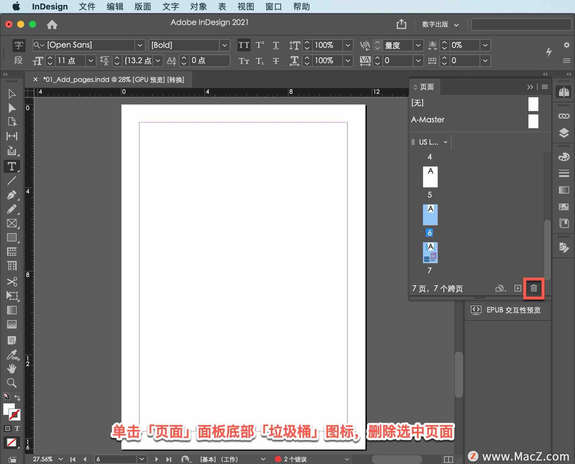单击「页面」面板底部「垃圾桶」图标,删除选中页面。