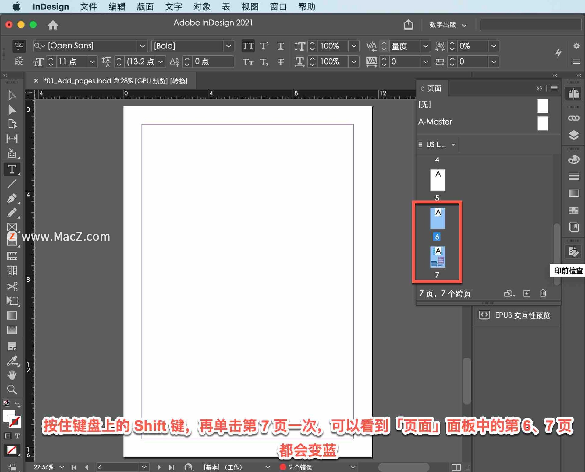 然后按住键盘上的 Shift 键,再单击第 7 页一次,可以看到「页面」面板中的第 6、7 页都会变蓝,表明其被选。