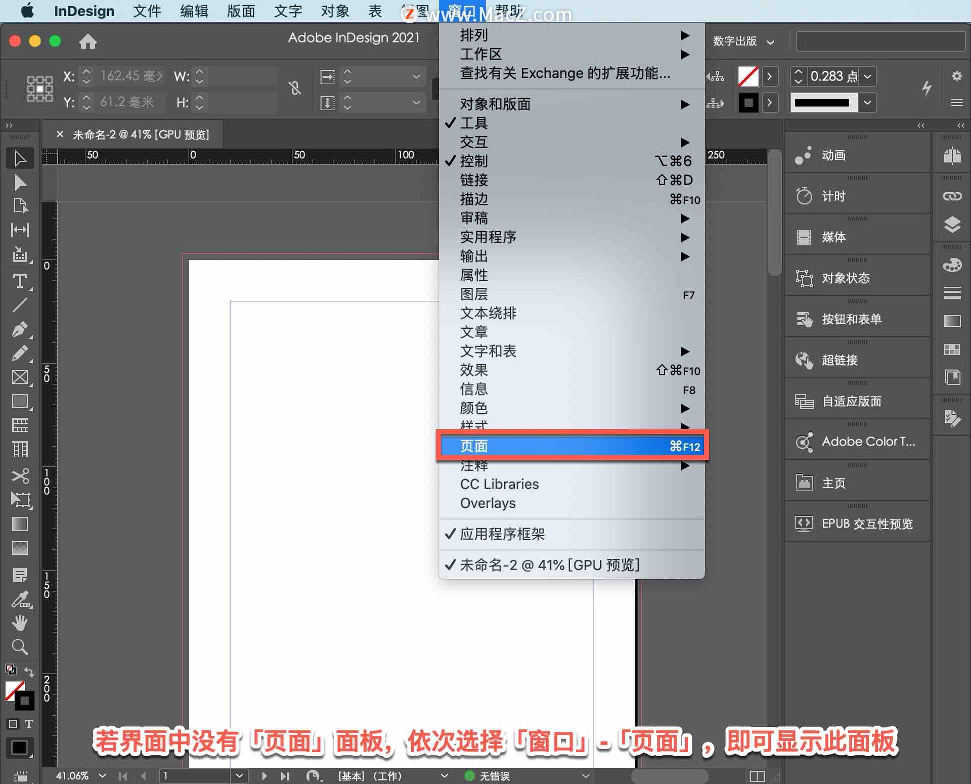 InDesign 开始只显示新文档的第一页,要查看文档有多少页,可以使用「页面」面板。若界面中没有「页面」面板,依次选择「窗口」-「页面」,即可显示此面板,而且可以看到文档中每个页面的缩略图。