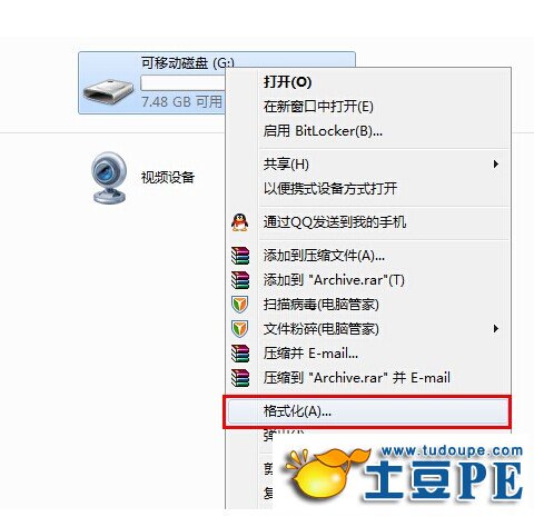 把U盘格式化成NTFS格式即可,因为新U盘一般都是FAT32文件系统,而FAT32无法存储单个大于4G以上的文件。进入WIN7系统桌面,双击“我的电脑”,右键打开U盘装系统盘的属性,如下图:
