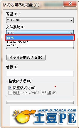 将文件格式选择为NTFS,进行快速格式化