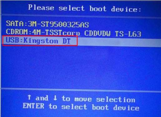 3、选择U盘选项后回车进入下一步,注意:通常带有“USB”字样的选项即为U盘选项。另外如带有uefi字样的就是启动进入uefi模式。下图我们进入的就是非uefi启动盘选项。