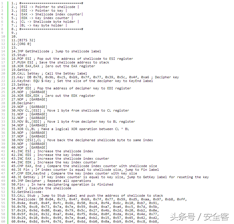 解码器的逻辑非常简单,它使用一个随机生成的多字节XOR密钥来解码shellcode,在解码操作完成后将执行它,在将shellcode放置在解码器头之前应该使用多字节的XOR密钥加密,且shellcode和XOR密钥应该在“”,””标签内,
