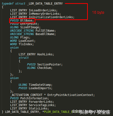 现在我们的指针指向InMemoryOrderModuleList是一个LIST_ENTRY结构,Windows定义这个为包含进程模块的双向列表。这个列表中的每项是指向LDR_DATA_TABLE_ENTRY结构的指针,这个结构是我们主要的目标,包含加载模块的所有地址和名字,因为模块加载的顺序可能改变,我们应该校验全名,以便选择包含我们要查找的函数的动态库,这能简单的通过在LDR_DATA_TABLE_ENTRY向前移40字节做到,如果名字匹配了,则正是我们寻找的那个,我们在结构中向前移16字节,能得到加载模块的地址。