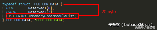 ldr结构包含了进程加载模块的信息,在ldr结构向前偏移20字节,我们得到InMemoryOrderModuleList中的第一个模块,