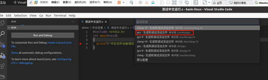 选择 gcc - 生成和调试活动文件,参考截图如下