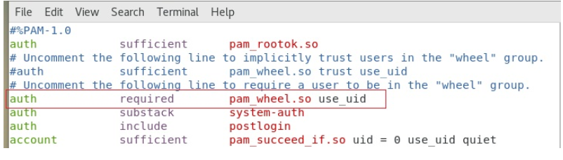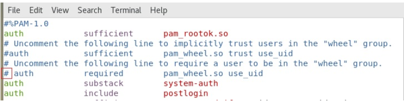 步骤2:编辑文件,去掉auth required pam_wheel.so use_uid这一行前面的#,使这一行配置生效