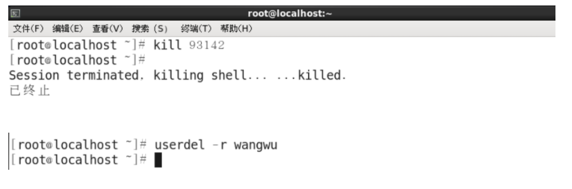 备注:也可以在登录需要删除的用户之后,按下快捷键“ctrl+d”进行对当前用户的注销,随后退回到上一个用户(root)此时就可以对需要删除的用户进行删除操作。