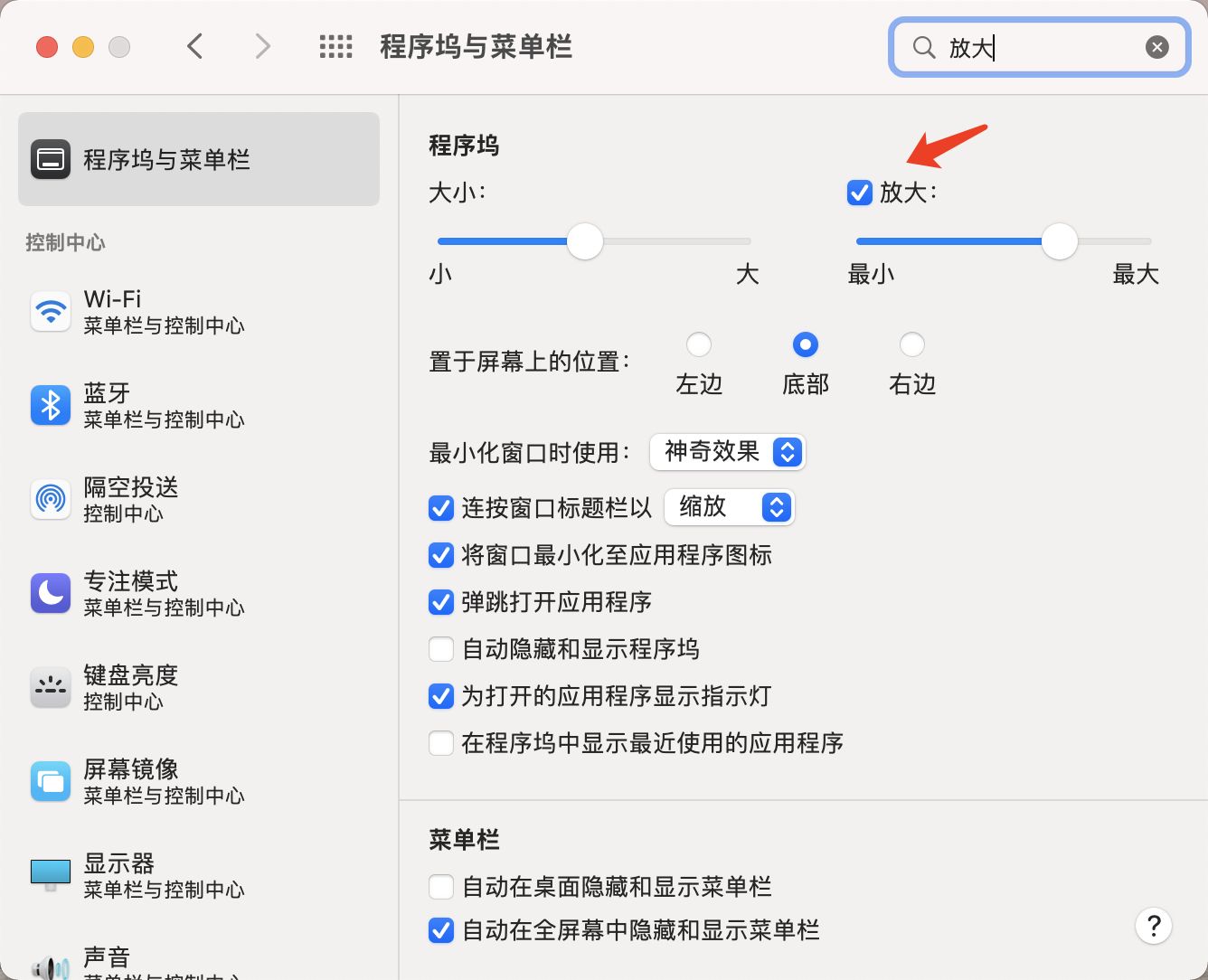 将光标放在程序坞上,可以看到程序有放大效果,可以方便我们精准的选择应用。具体设置如下;