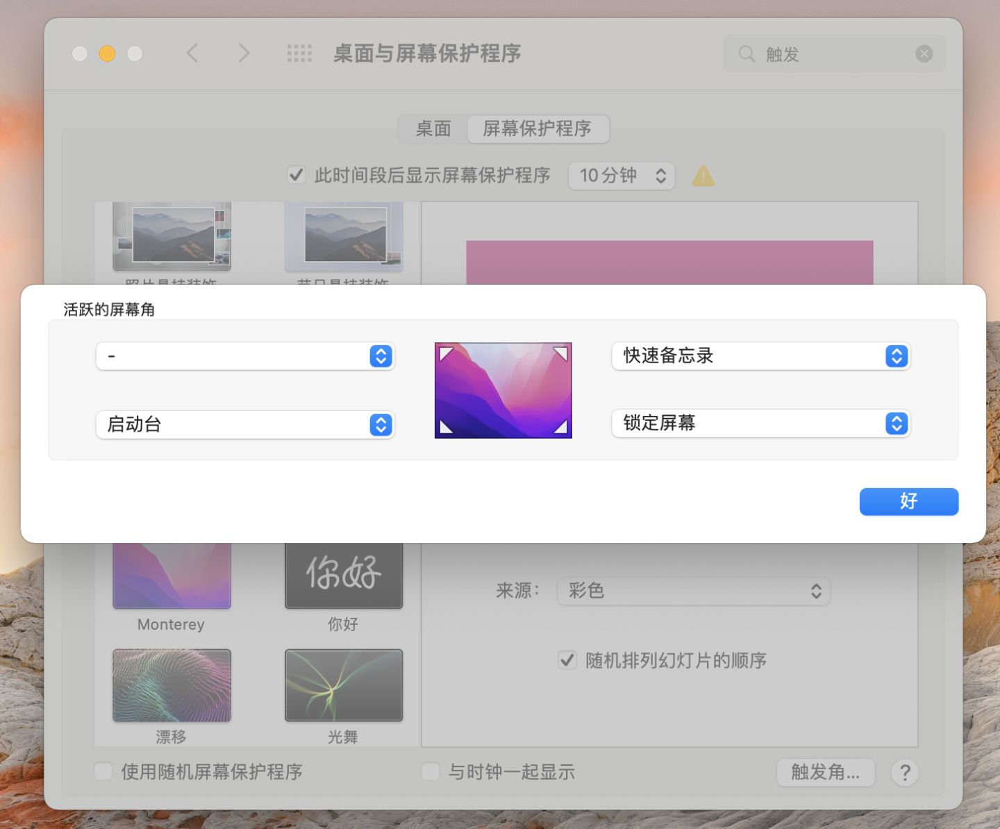 首先第一个比较好用的功能就是触发角,触发角mac独有的一个设置,它的功能就是当你把光标放到屏幕的四个角落,就会唤起自己设置的一些功能。比如:快读备忘录、锁定屏幕、将电脑进入息屏状态,等快捷功能
