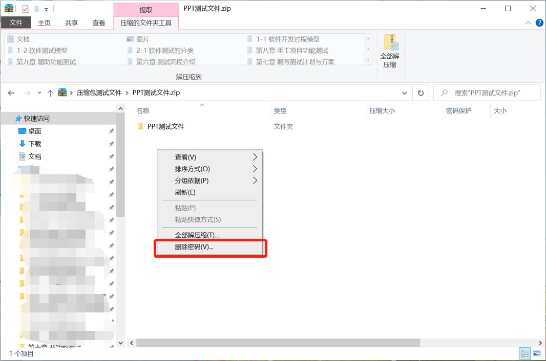 打开拉链文件后,右键单击空白并选择 [删除密码]。