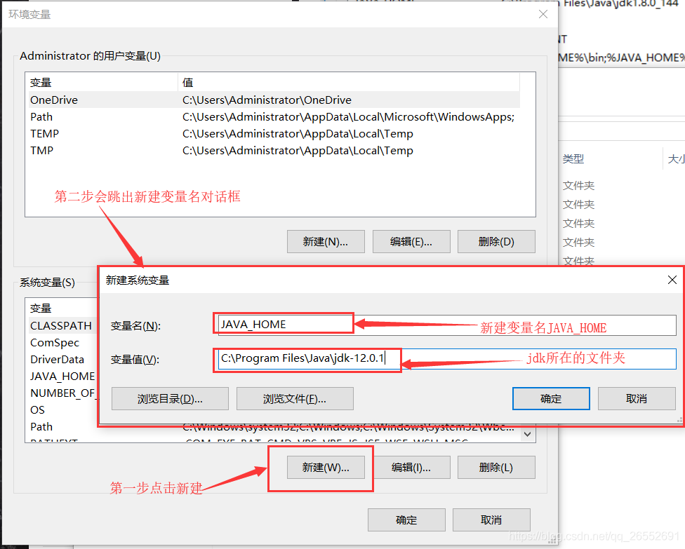 三。当你点击环境变量时,如下图所示,它跳出对话窗口。第一步是选择“新”然后退出“新系统变量”对话框。一般而言,系统中没有JAVA_HOME变量。因此,在弹出式“ 新系统变量” 窗口中, 我们输入变量名称 : JAVA_ HOME 。填入“变量值”的以下值: C: 方案文件 Javajdk-12.驱动器 C 是安装的默认位置 。如果JAVA_HOME已经存在,只要插入分号( 即;) 在其变量值的结尾处,然后,在这个分号的结尾, 把jdk路径。