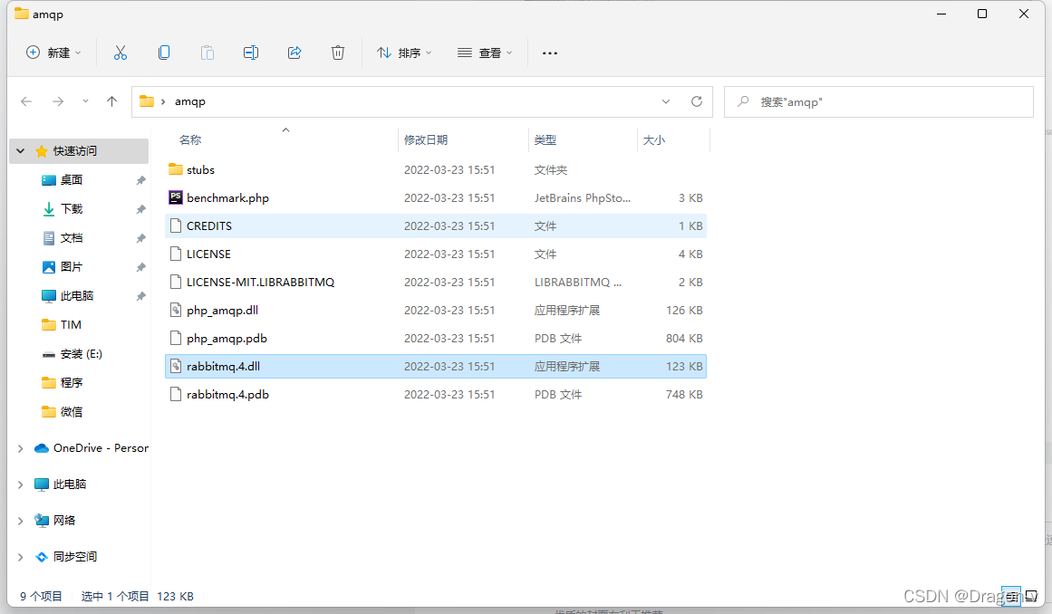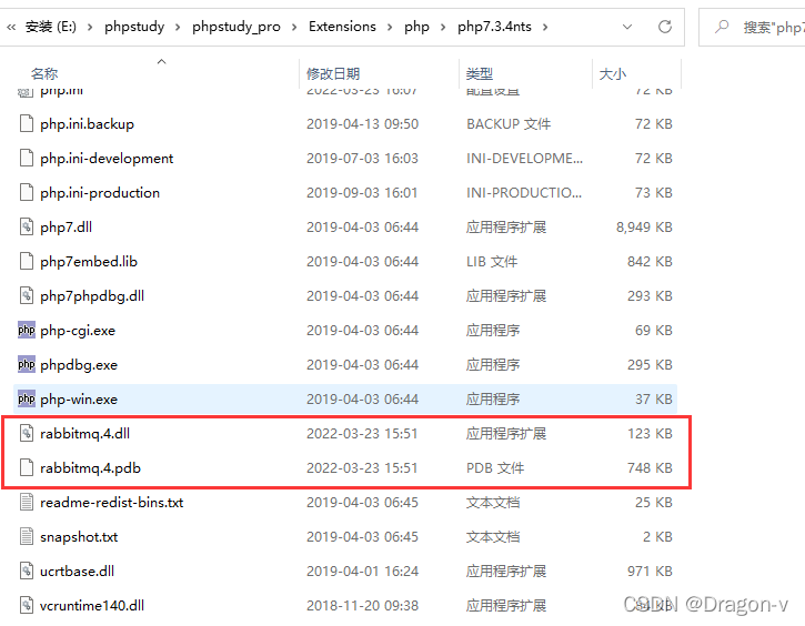将 php_ amqp.DLL 和 php_ amqp.pdb 文件复制到 php/ ext 目录 。