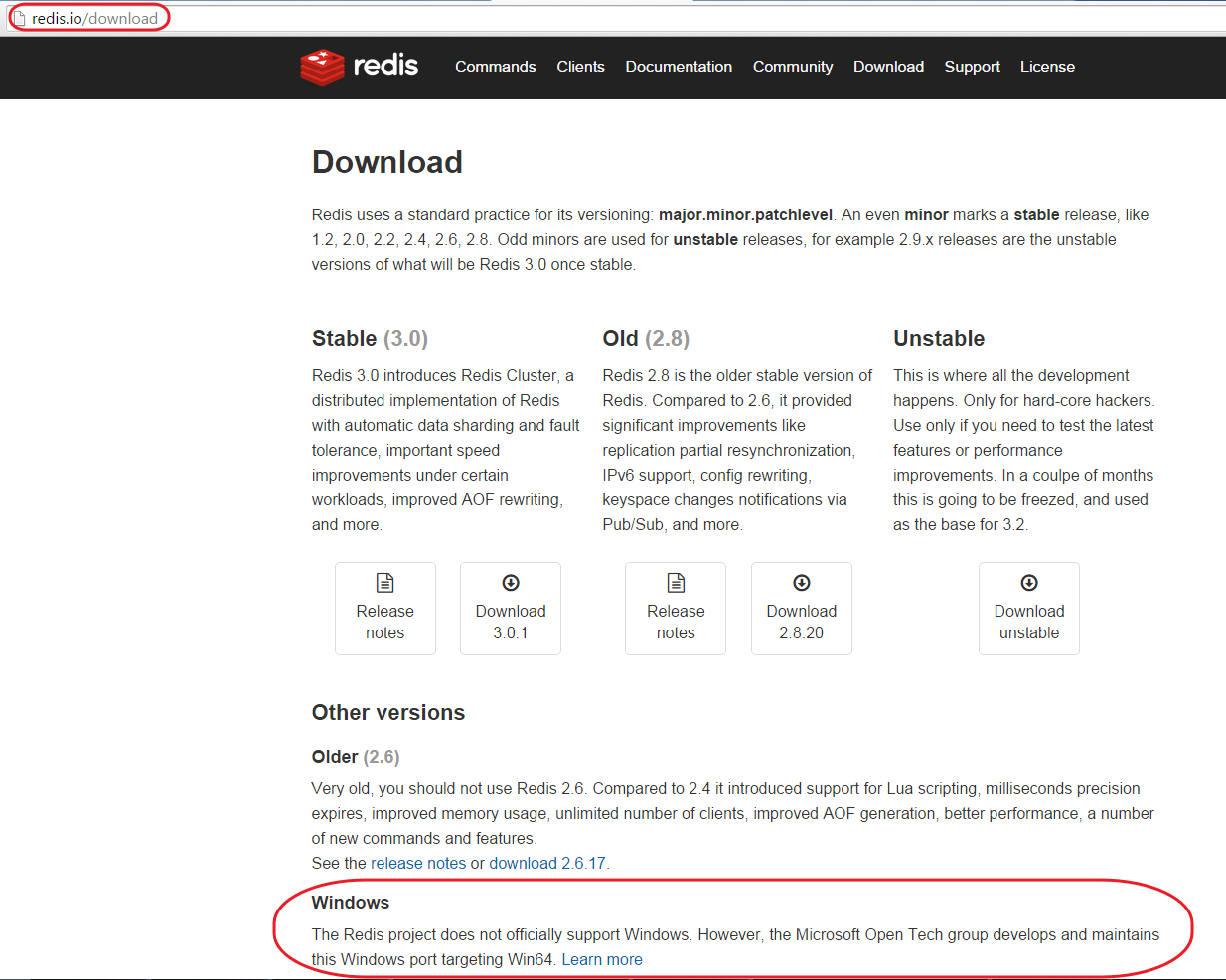 打开Redis官网,我们发现Redis官方并不支持Windows平台,但Microsoft Open Tech Group却改变了这一情况