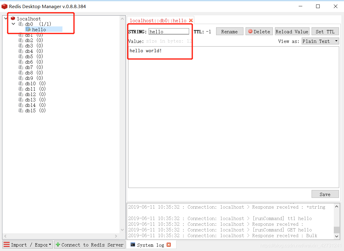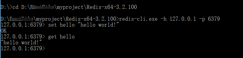 在 cmd, 键入以下命令, 启动客户端, 并创建一个关键值缓存, 配有关键价位 hello 和 值位 hello world!