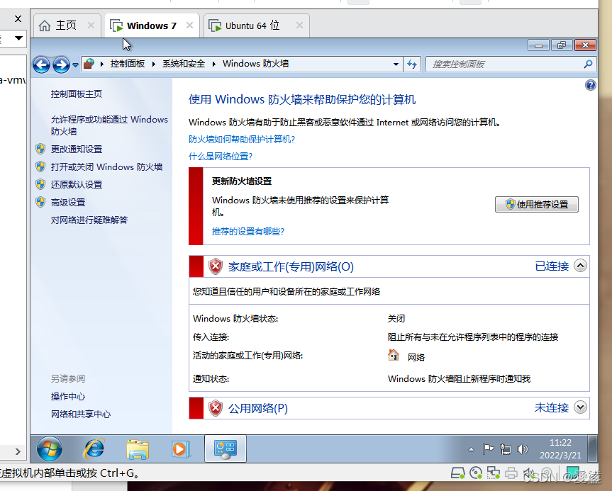 然后配置实验环境,启动 Windows 7 的 Windows 防火墙界面。并把它关闭。因为它会对实验结果产生影响所以建议关闭。接下来,我们将尝试在Windows 7上打Kali, 检查我们能否达到它。检查 kali ping win7 是否访问 。目的是确定这两个网络是否相互联系。可访问视图结果。