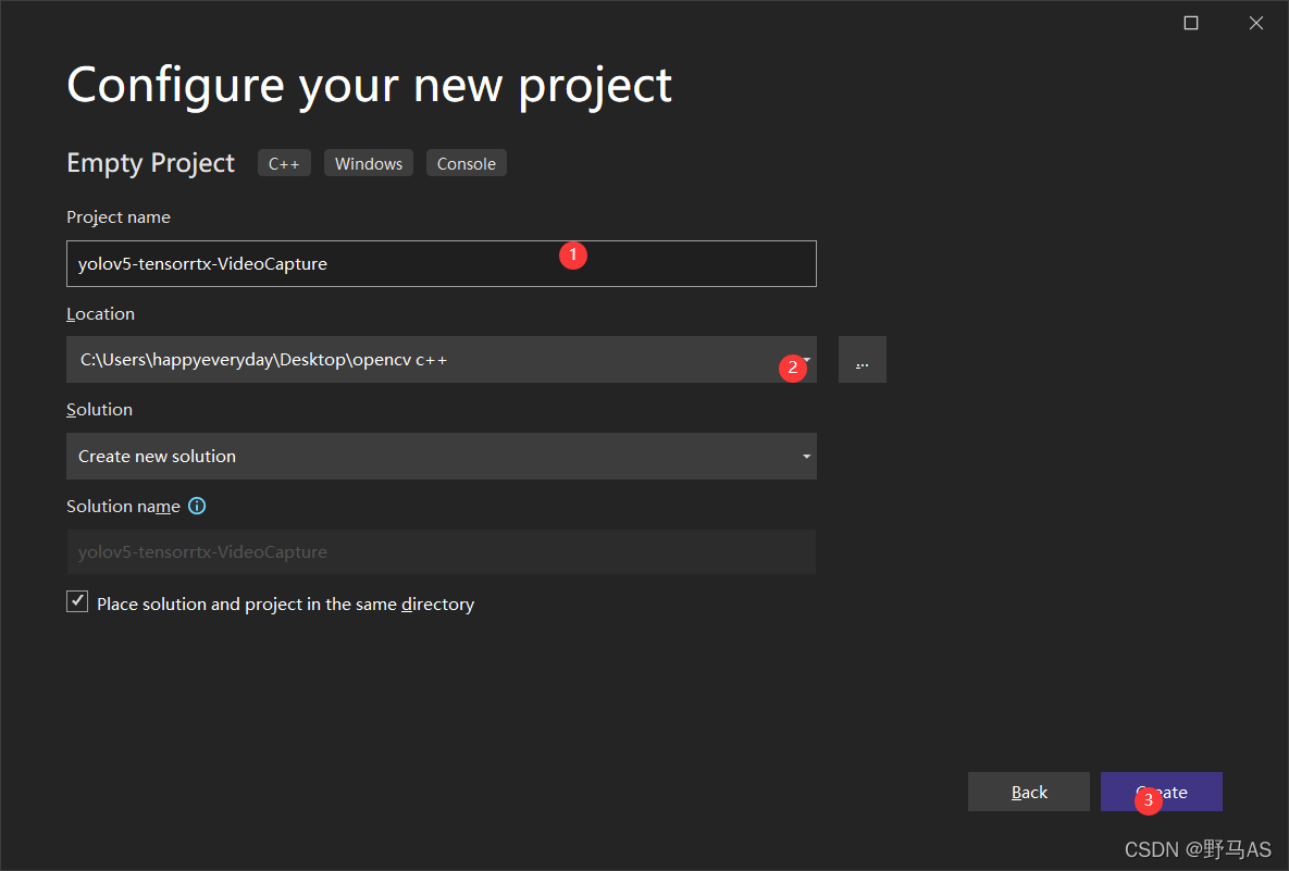 2 输入项目名称和要保存的文件夹目录,然后单击框单击创建 VS 项。