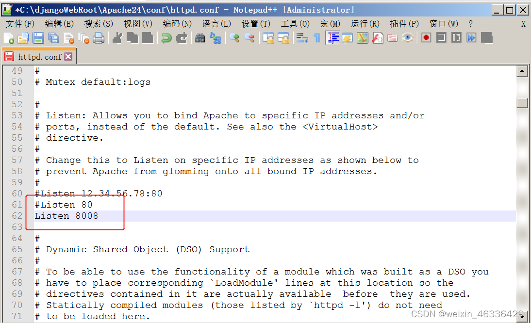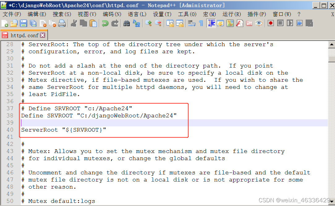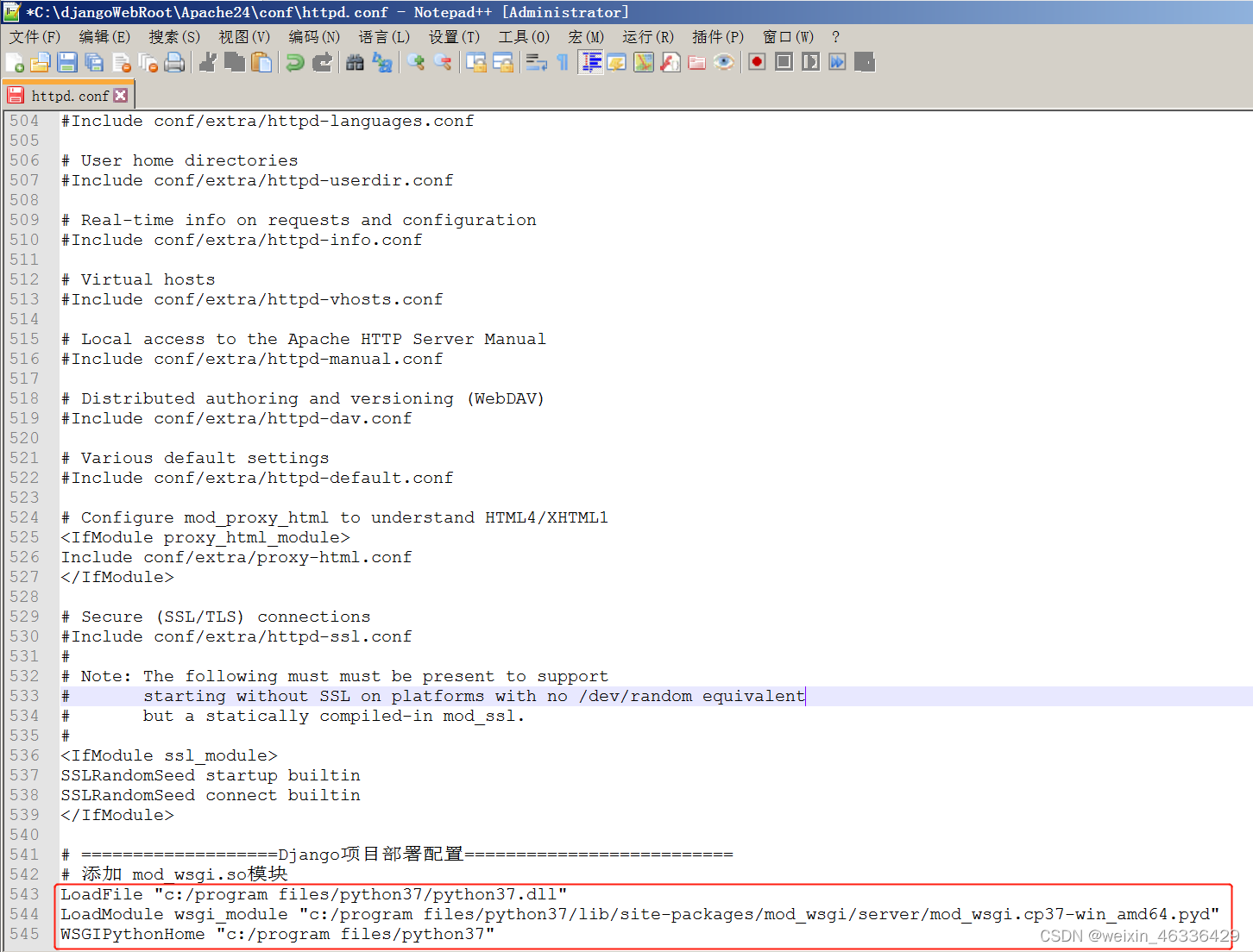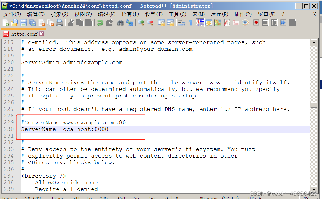 2 Apache 设置和修改 httpd.int 经常访问conf.conf 中的欢迎界面, 在 notepad++ 中编辑 httpd.com.conf, 并将路径更改为 apache root 目录 :