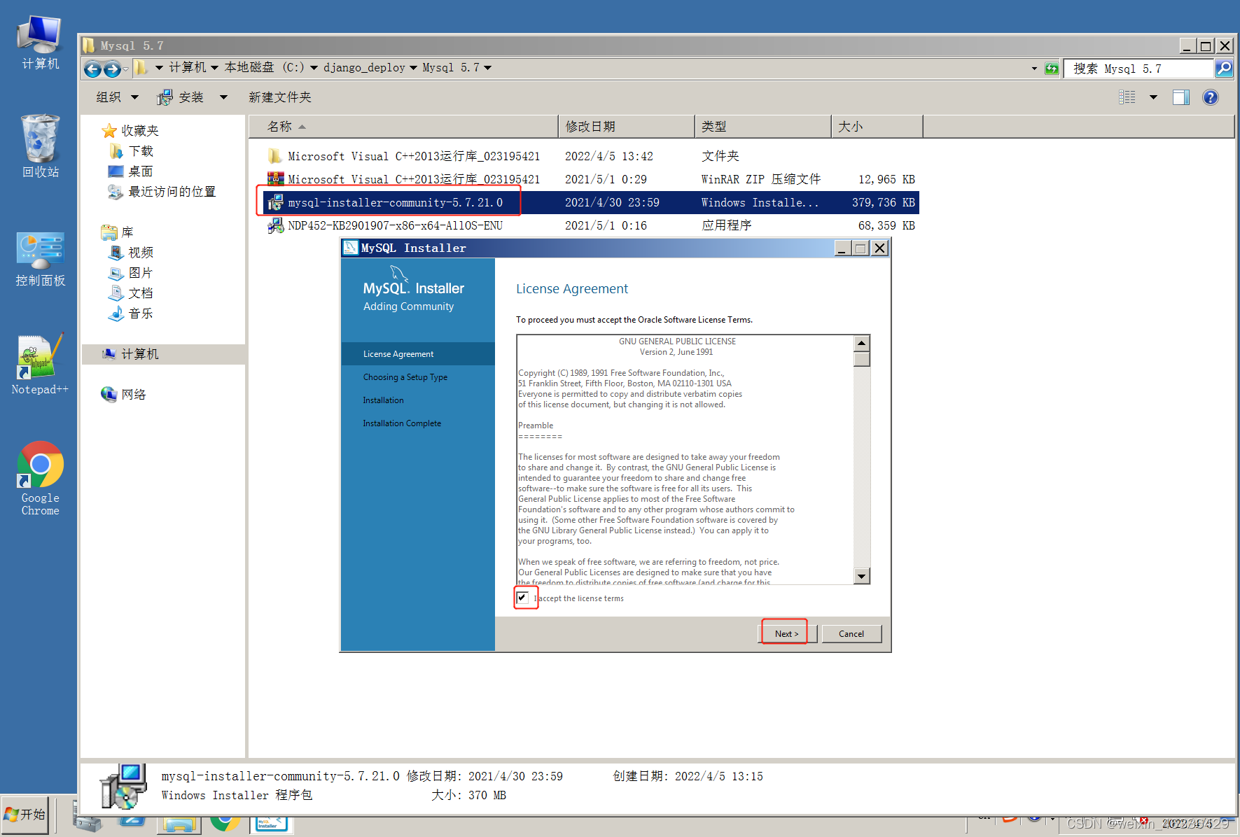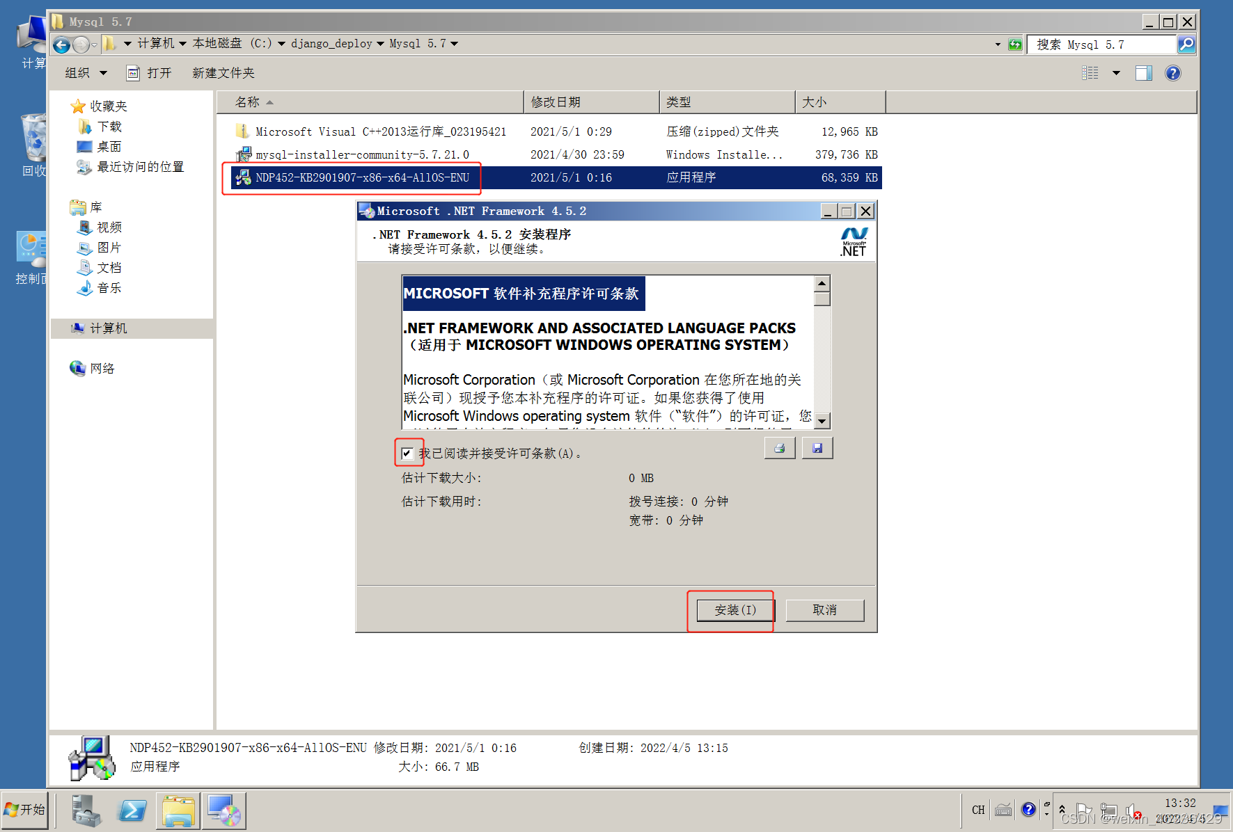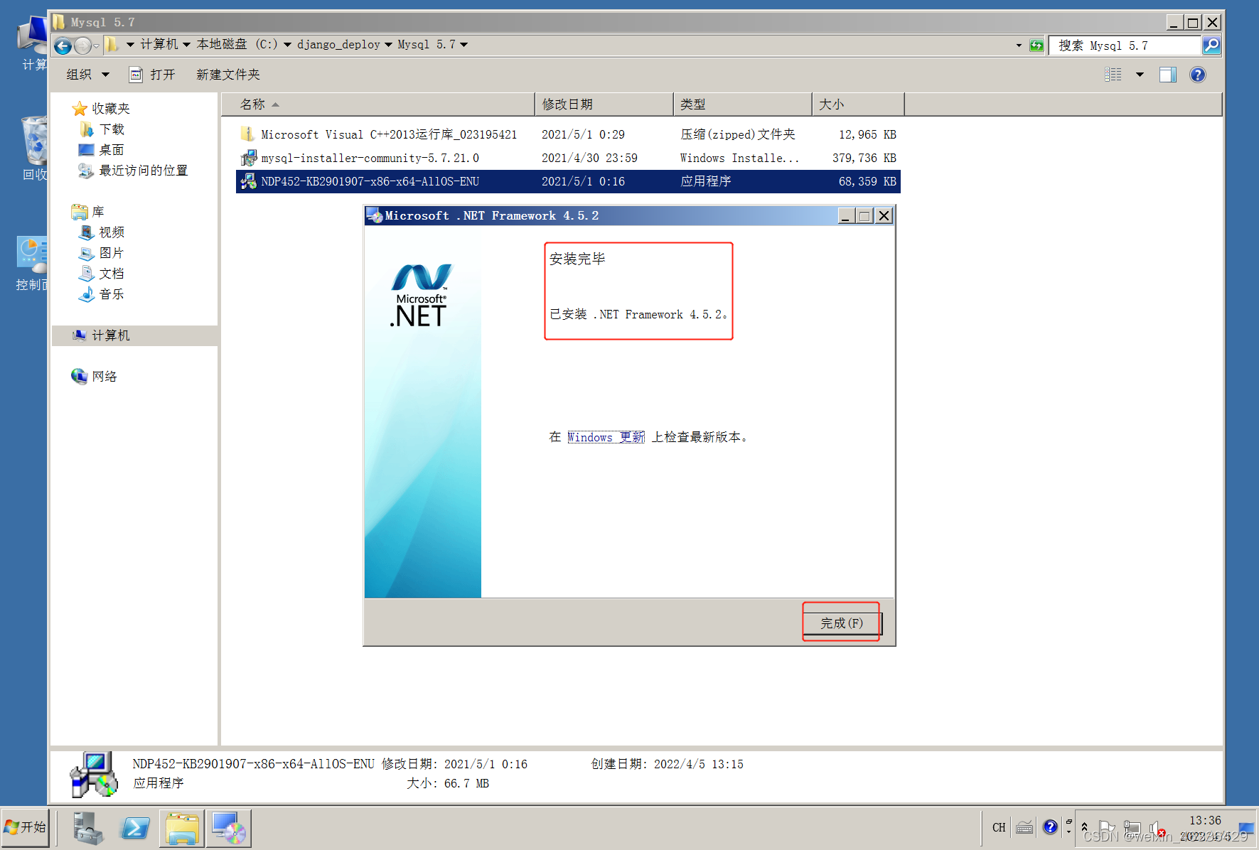 第1次,安装.Net框架4.5.2,以启动 Mysql 安装。