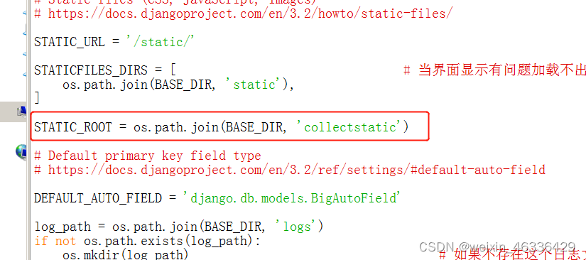 STATIC_ROOT: 这是部署后配置所使用的静态资源路径 。当贾尼戈在一种生产环境中被使用的时候,其静态文件存取界面没有得到Django框架的支持。为了提供一个静态存取条目,必须在Django框架前端部署金字塔或其他网络服务器。这是后缀 STATIC_ROOT的目录