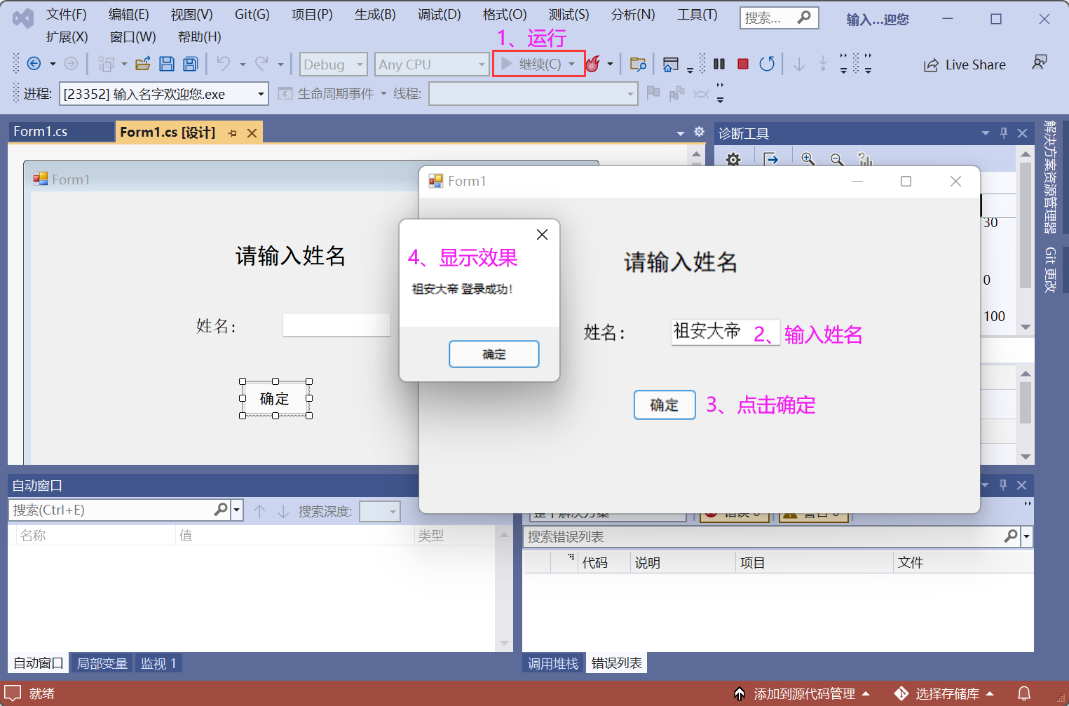 响应事件:指定视觉界面事件处理代码、不同控件、窗体有不同事件,为每个控件的不同事件确定程序,并对定义的控制事件作出反应,例如点击按钮将触发哪些事件。