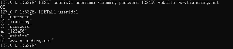 HMSET userid:1 username xiaoming password 123456 website www.biancheng.net