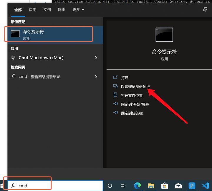 要开始, 请在 Windows 任务栏左下角定位搜索按钮, 输入 cmd 命令, 然后选择“ 以管理员身份运行 ” 。