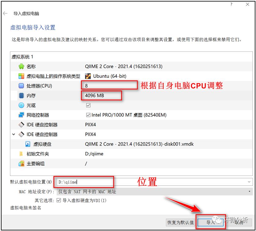 在导入窗口中,在QIIME 虚拟系统中,选择可用的内存和CPU核心的数量。一般而言,它取决于计算机的设置(与设备经理的接触--检查计算机中处理器的数量)。一般数据处理至少需要四个CPU核心和8GB内存。提供的内存和CPU功率越多越好。虚拟机器处理更快的QIIME2数据。选择最好的安装场地,要开始安装, 请单击导入 。