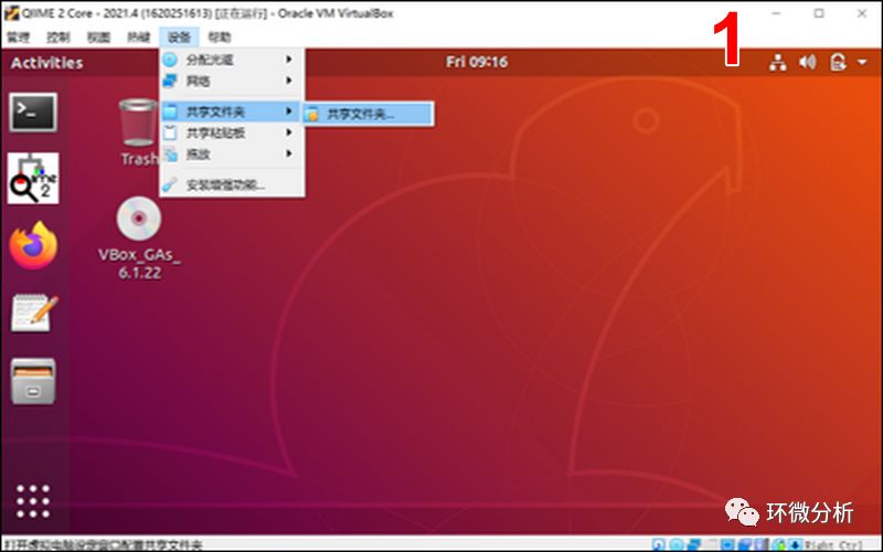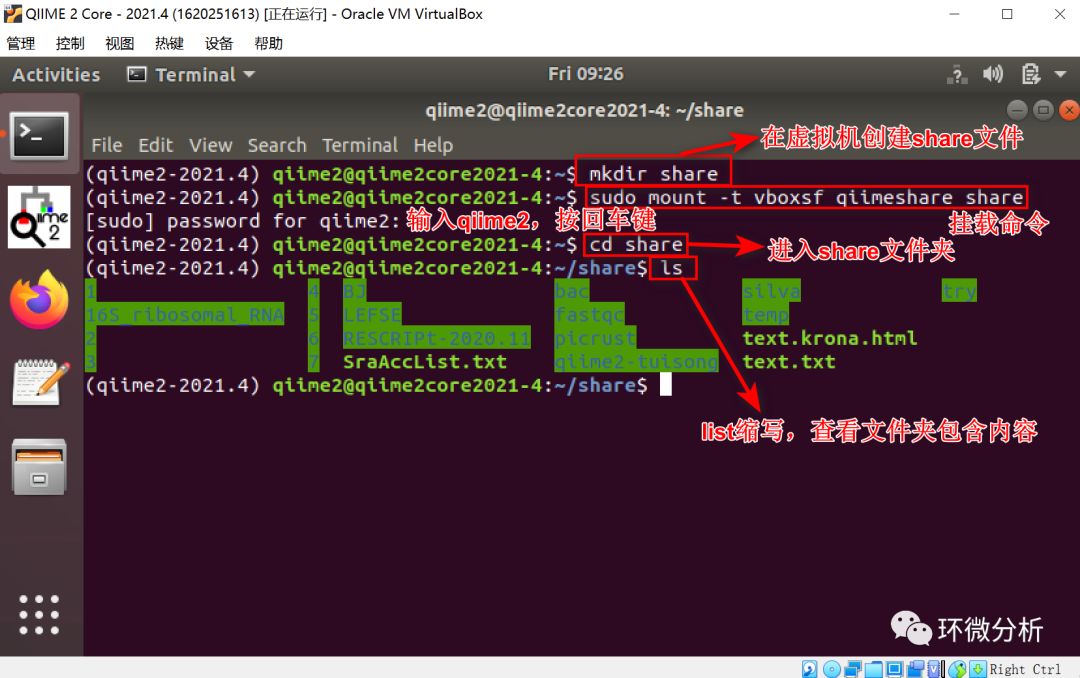 在虚拟机器上, 挂载共享文件夹 。要启动终端窗口,请单击左侧的终端图标。输入命令: mkdir 共享; 然后输入命令: sudo 月亮 - t vboxsf qimeshare 共享要挂载 。其中,在 QIIME 虚拟系统环境中, mkdirshare 命令创建了一个名为“ 分享” 的文件夹 。sudo - t vboxsf qimeshare 共享命令链接在 Windows 中建立的“ qimeshare” 文件夹, 与 QIIME 虚拟系统环境中的“ share” 文件夹连接。无法删除文件夹“{0}”。