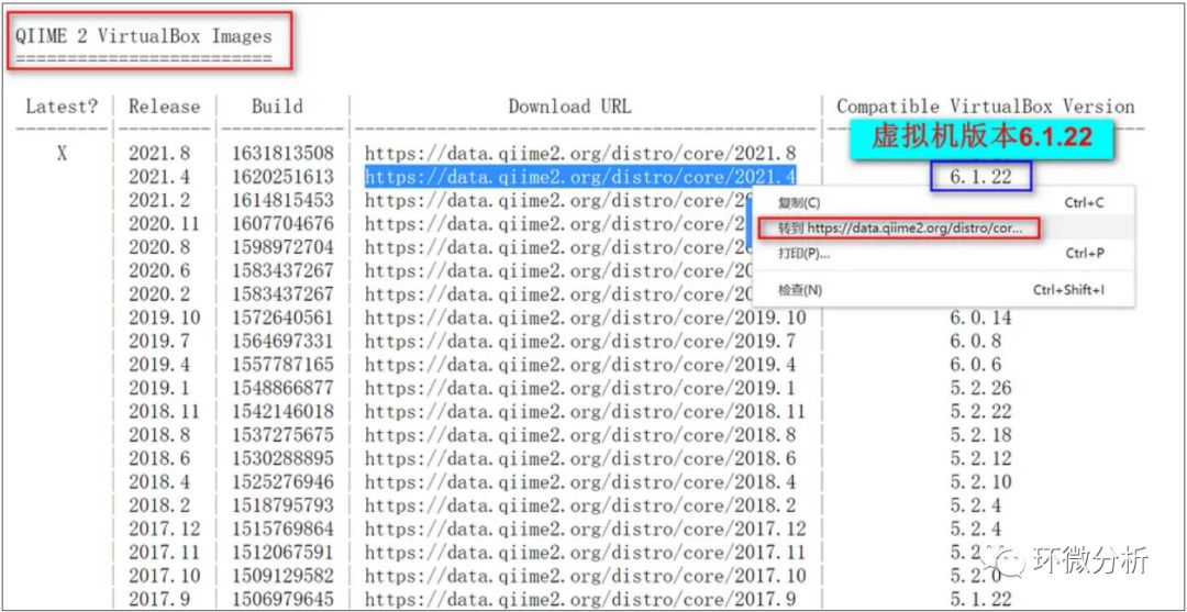 要访问 QIIME2 虚拟镜像下载界面,请点击“虚拟Box 图像”。在下载 URL 列中,单击 QIIME2 版本链接跳转到下载 。此页面右侧的列“ 兼容虚拟框版本” 可以帮助您找到可兼容的 QIIME 2 版本的虚拟机版本 。例如,虚拟Box6.一. 22是相当于QIIME20214版本的虚拟机器。