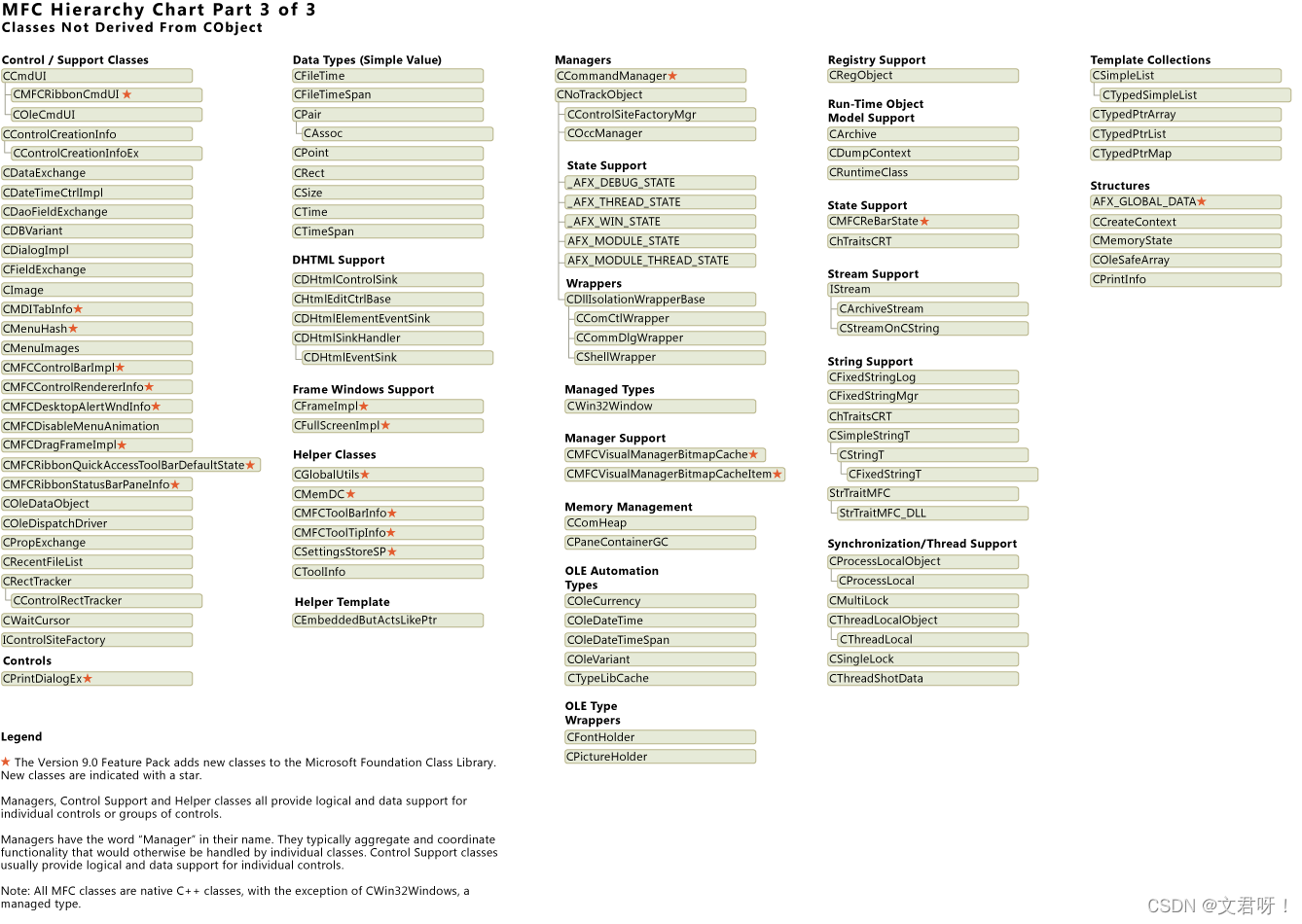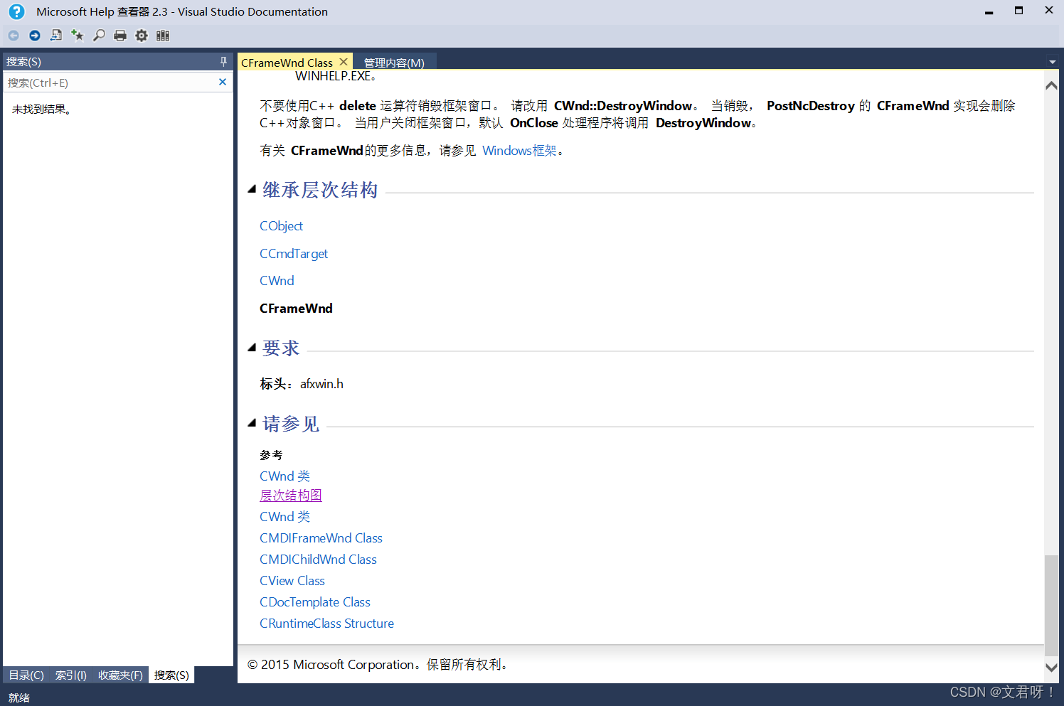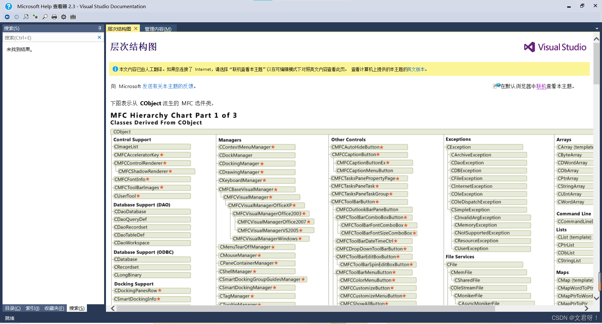 提示:如果你想看看某类或某方法如何帮助你,因此,您可以将指针移到该类或函数的位置。然后按F1键,您可在MSDN获得相关援助。在MSDN帮助网站的每个解释页底部,有一个“等级图”。"超常超链接,单击此链接,现可提供全部MFC级的组织结构图。
