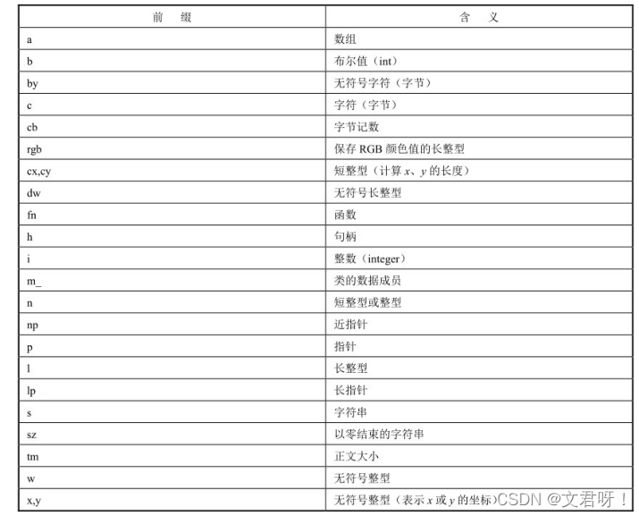 因为Windows程序通常很冗长,在特定时间里,程序员可能会忘记所宣布变量的含义。为了帮助您回忆和区分变量,微软为Windows做了一个命名交易, 它不会工作。"匈牙利语的注解"匈牙利立法具体规定了一套前缀字符以及前缀清单。如下所示,这些前缀也可以混合使用。