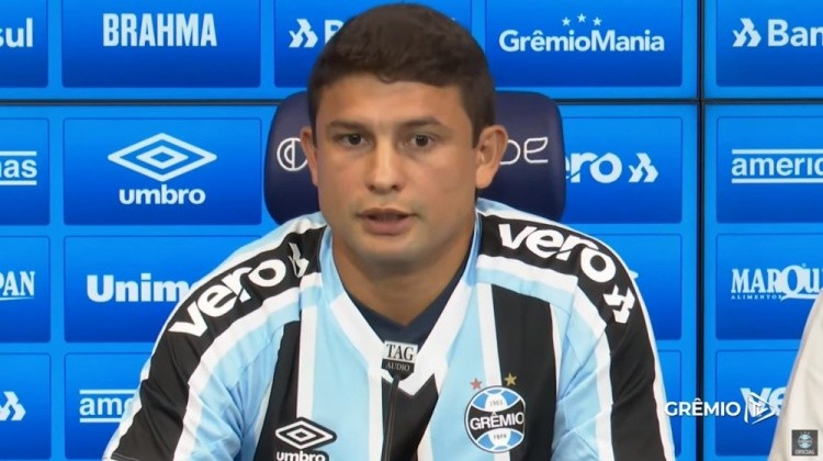 埃克森在4月13日的Gremio Union Gremio locdurion举行记者招待会, 他透露他将在即将到来的赛季穿Gremio 9球衣,