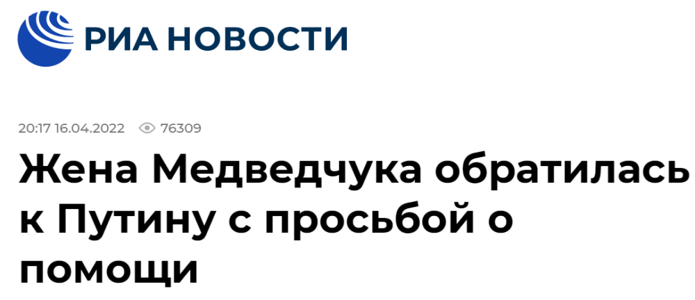 据俄罗斯通讯社报导, Medvechuk的妻子向普京求助。