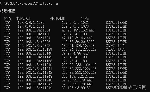 显示源端 TCP 连接 。在其中一个港口,可以听到计算机的声音。以太网统计,IP路由表,IPV4(关于IP),ICMP,TCP,此外,还有联合民主党协议和IPV6数据(关于实施伙伴)。ICMP,TCP,和UDP协议)。使用无参数,网络显示当前运行的 TCP 连接 。