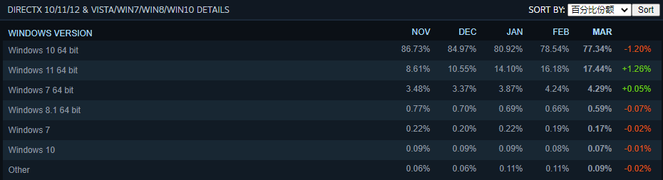 去年10月以来只增加了17个,44%的蒸汽用户更喜欢Windows 11。